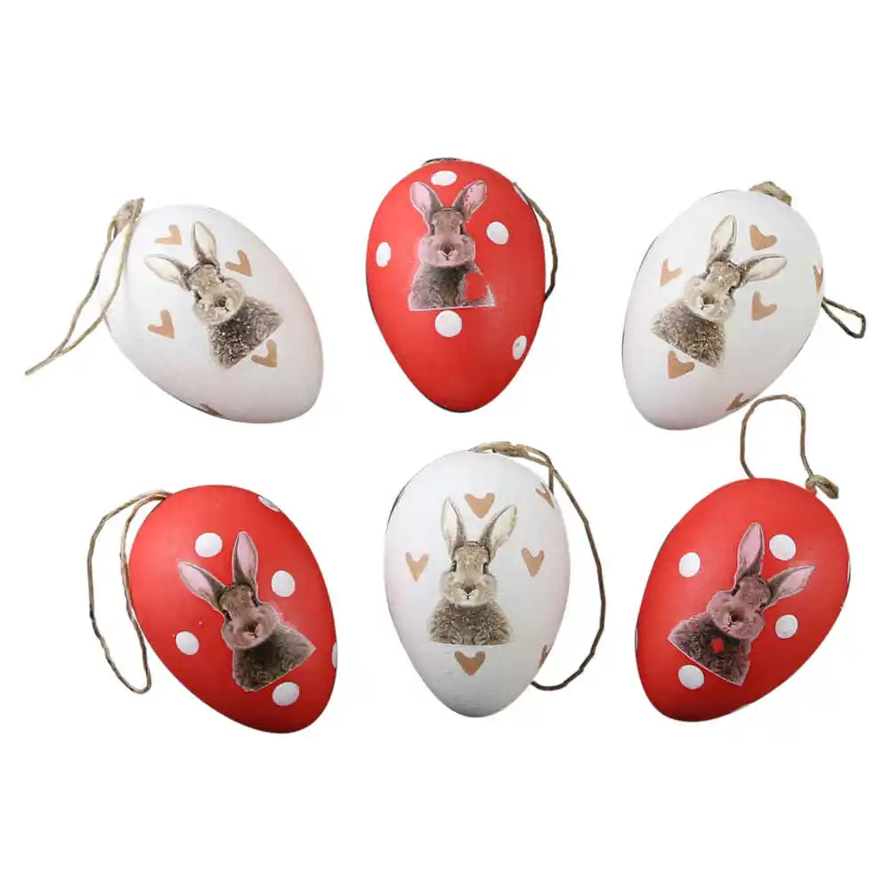 Set 6 oua din plastic 4×6 cm, albe & rosii cu iepurasi