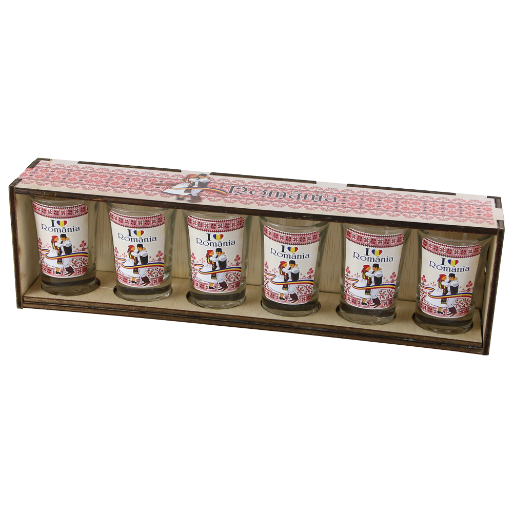 Set 6 pahare shot „Romania”, cu suport lemn, traditional 29.5×8 CM