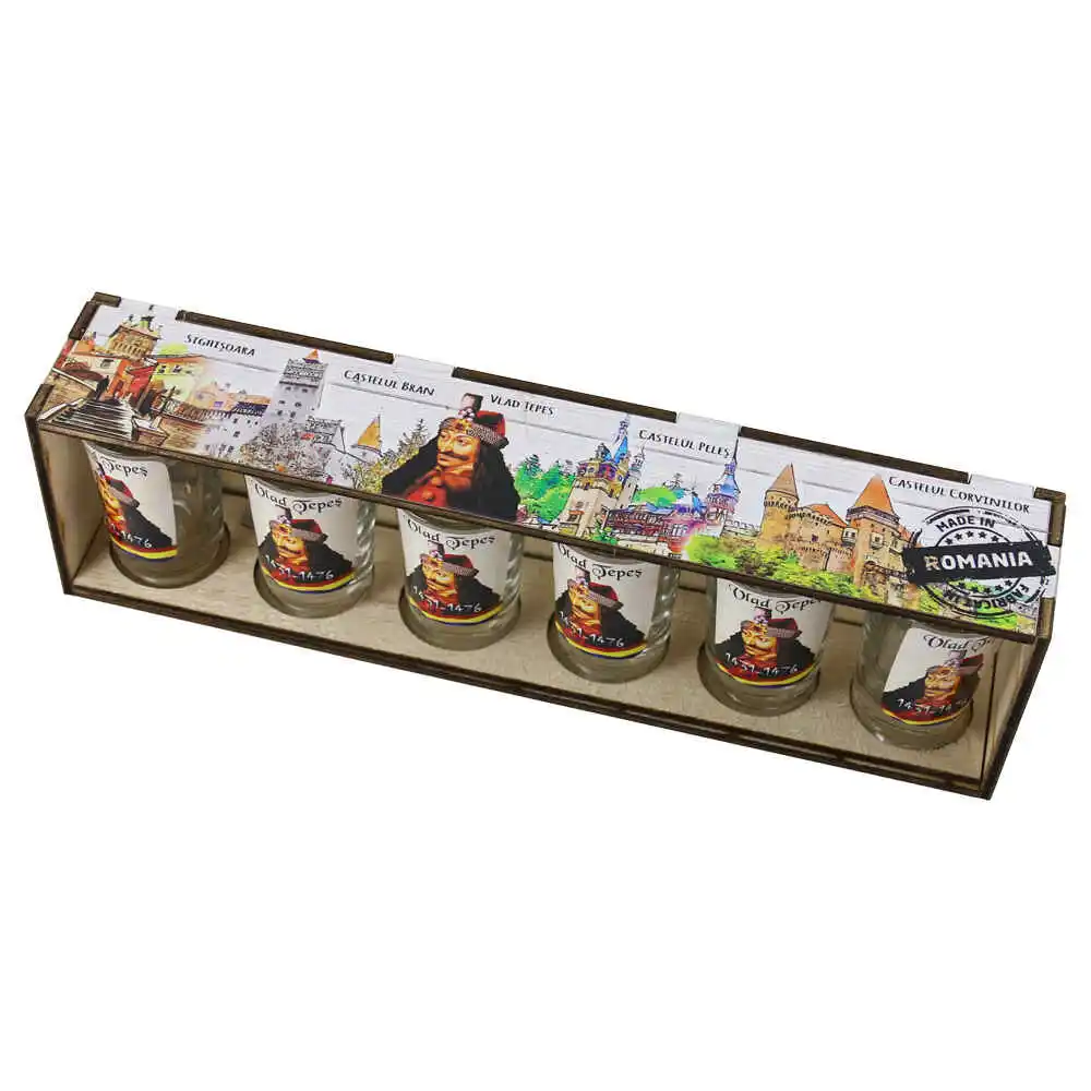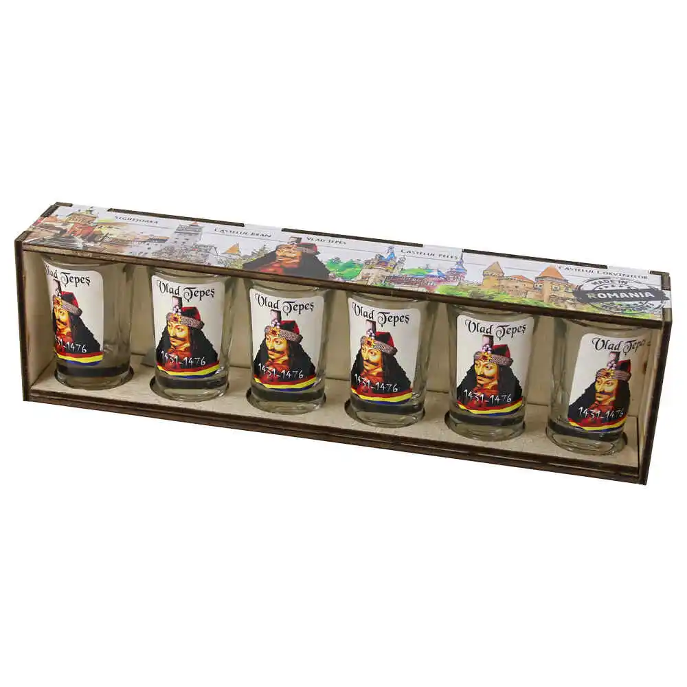 Set 6 pahare shot „Vlad Tepes”, cu suport lemn 29.5×8 CM