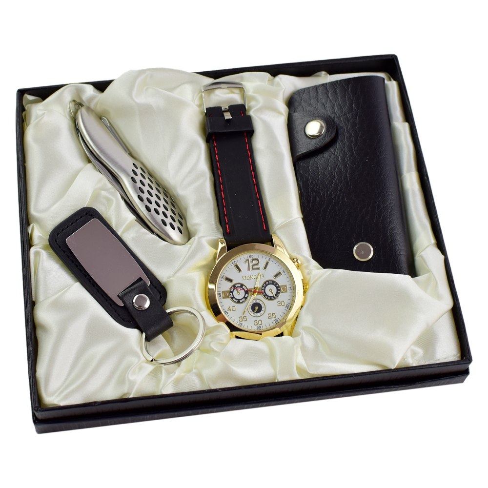 Acest set elegant se afla intr-o cutie si poate fi un cadou ideal barbatilor cu ocazia evenimentelor speciale. Articolele daruite cu siguranta vor fi apreciate si folosite. fiind utile pentru barbati in mai multe momente. Setul este format dintr-un ceas. un breloc . un briceag multifunctional si un port chei.