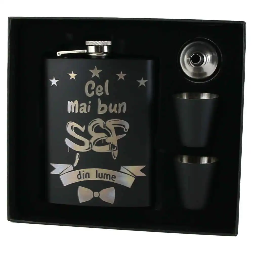 Set cadou „Cel mai bun Sef din lume”, Plosca cu palnie si 2 pahare