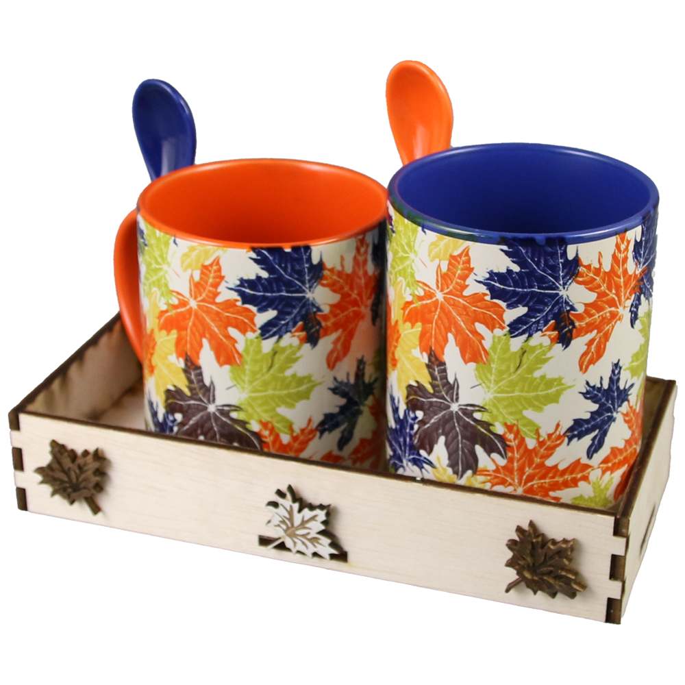 Set cadou cu 2 cani + lingurite si suport din lemn, Frunze de toamna, 330 ml