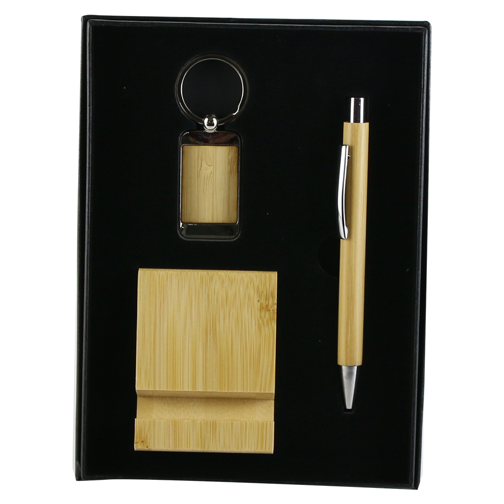 Set cadou cu Suport telefon, breloc si pix, din bambus
