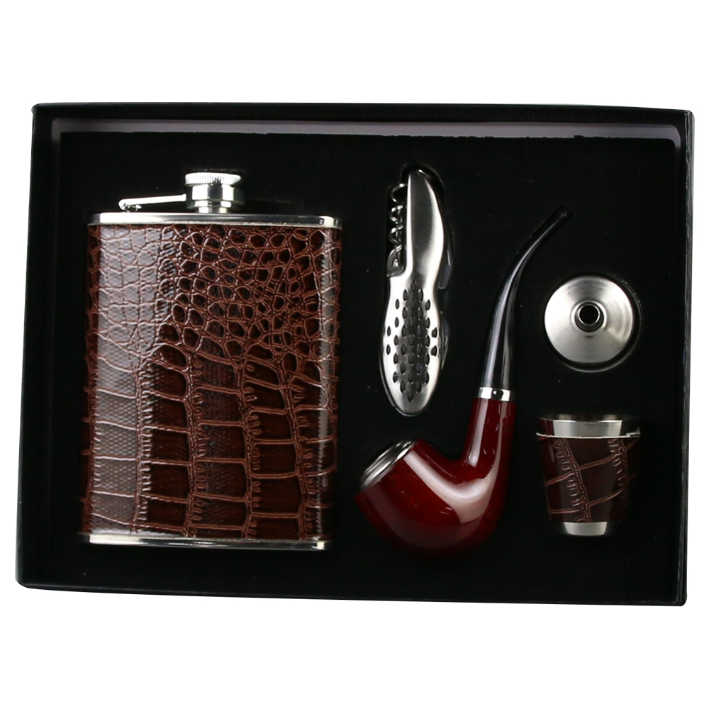 Set cadou pentru barbati, 5 piese, Plosca cu pahar & palnie, briceag si pipa