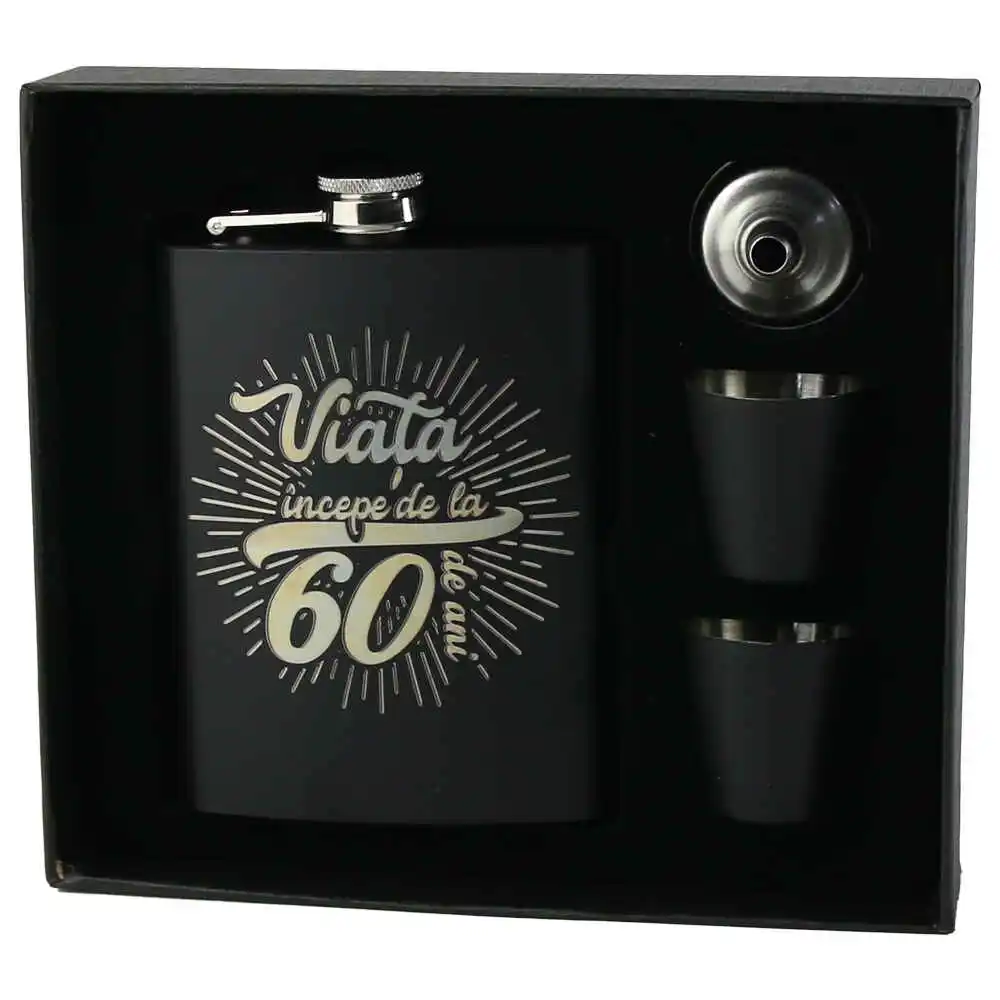 Set cadou „Viata incepe de la 60 de ani” Plosca cu palnie si 4 pahare