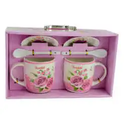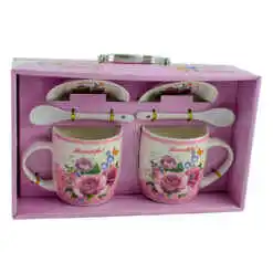Un cadou potrivit nu consta mereu intr-unul mare si costisitor. De multe ori micile atentii pot aduce zambetul pe buzele celor dragi. ca si acest set realizat din ceramica. format dintr-o cana. o farfurie si o lingura din care se poate consuma bautura preferata atat acasa cat si la birou.