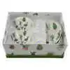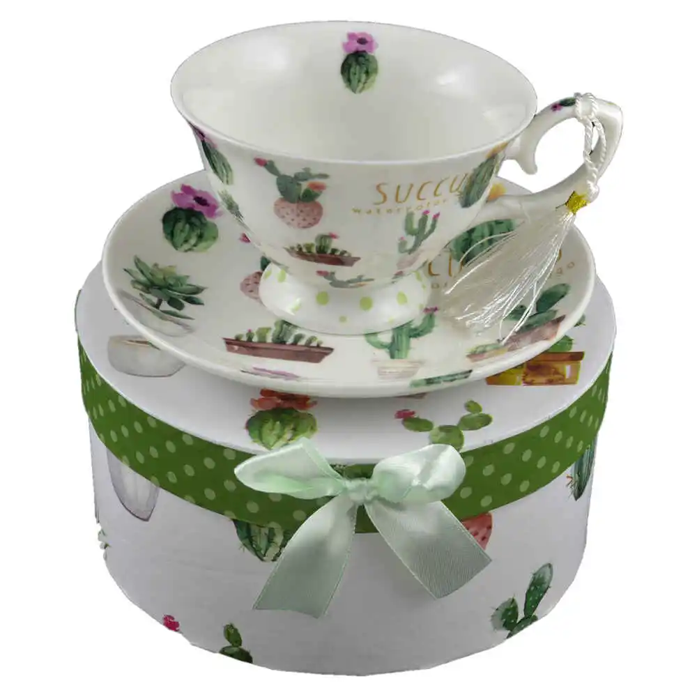 Acest set format dintr-o ceasca si o farfurie. este realizat din ceramica. avand un design cu cactusi si flori. Este ideal pentru iubitorii de bautura calda. putand astfel savura cafeaua sau ceaiul preferat in diminetile racoroasae si somnoroase alaturi de familie sau prieteni. Deasemenea. poate fi un cadou perfect pentru cei dragi. setul fiind asezat intr-o cutie cu aceeasi design.