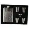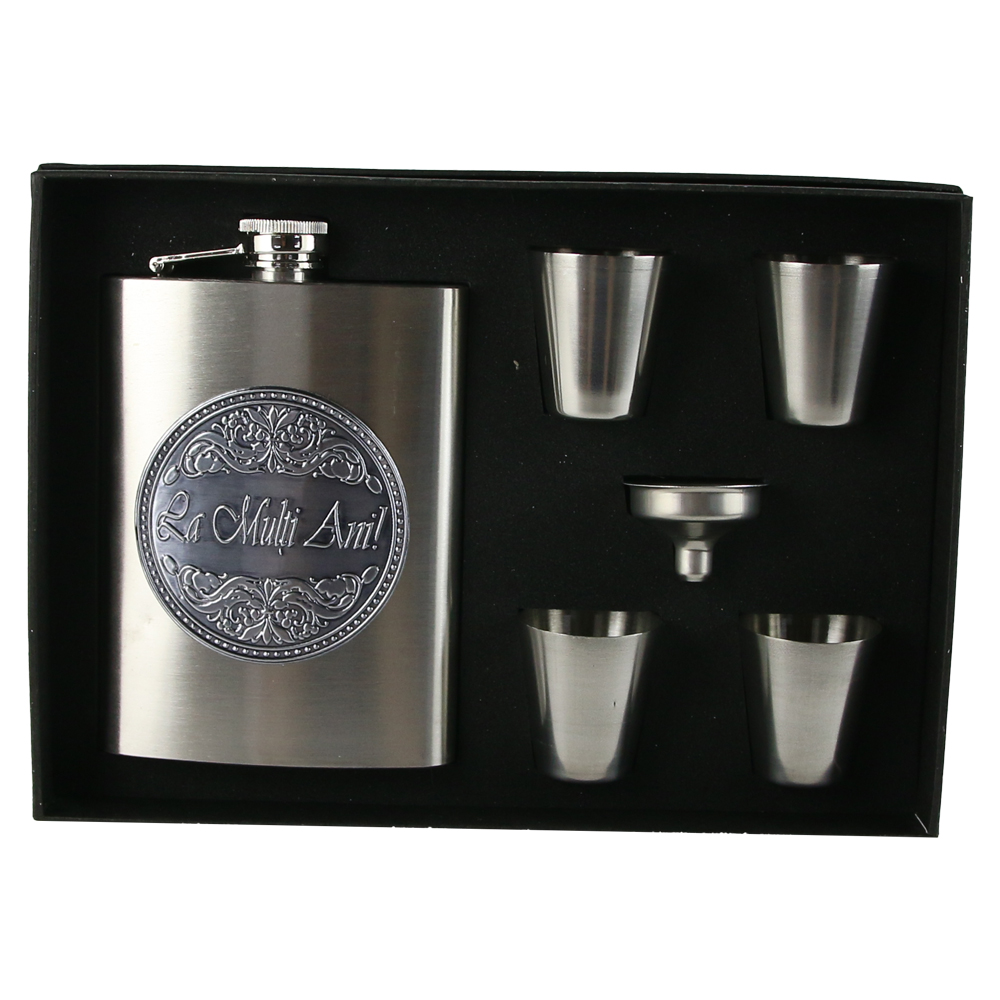 Set plosca cu palnie si 4 pahare din inox, „La multi Ani!”, in cutie eleganta