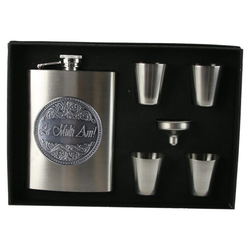 Set plosca cu palnie si 4 pahare din inox, „Pentru cel mai bun Prieten”, in cutie eleganta