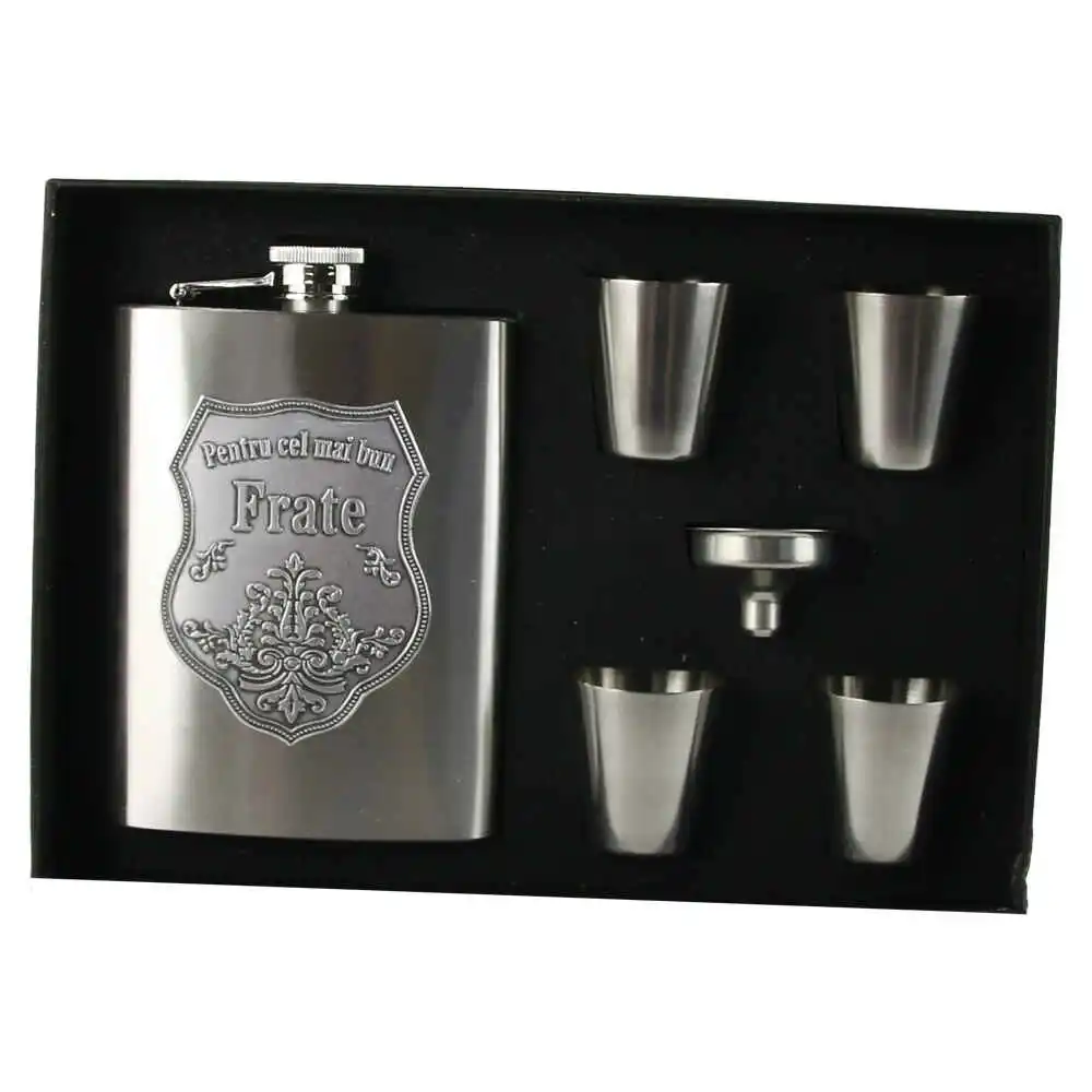 Set plosca cu palnie si 4 pahare din inox, „Pentru cel mai bun Frate”, in cutie eleganta