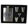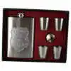 Setul respectiv contine 4 shot-uri si o plosca patrata. acestea fiind realizate din inox. Asezate intr-o cutie cu captuseala rosie. acest set este un cadou elegant pe care il puteti darui prietenului dumneavoastra. deoarece plosca respectiva este decorat