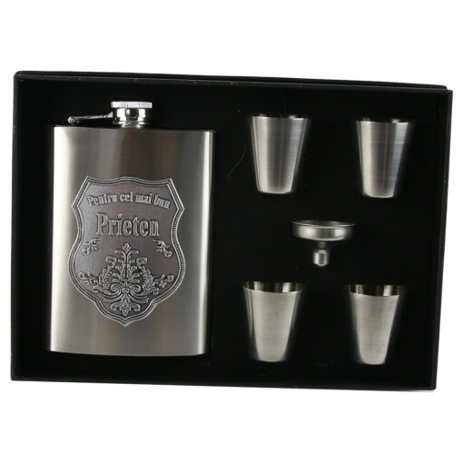 Set plosca cu palnie si 4 pahare din inox, „Pentru cel mai bun Prieten”, in cutie eleganta