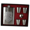 Setul respectiv contine 4 shot-uri si o plosca patrata. acestea fiind realizate din inox. Asezate intr-o cutie cu captuseala rosie. acest set este un cadou elegant pe care il puteti darui sefului dumneavoastra. deoarece plosca respectiva este decorata cu
