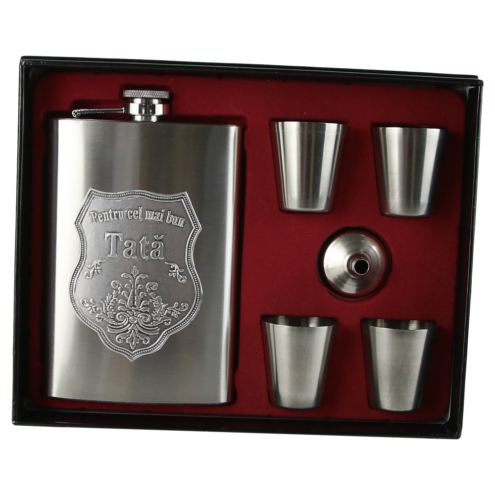 Set plosca cu palnie si 4 pahare din inox, „Pentru cel mai bun Tata”, in cutie eleganta