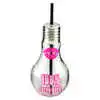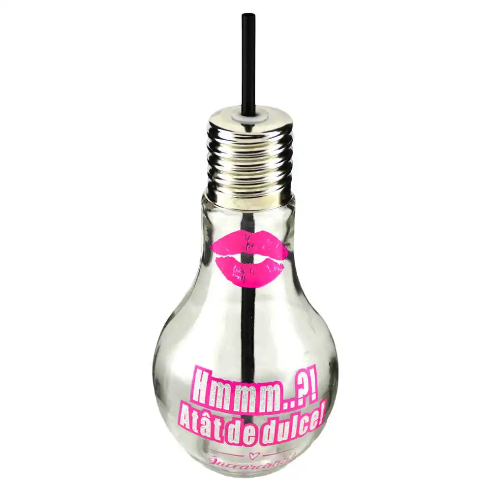 Paharul in forma de bec cu capac infiletabil si paie este cu siguranta un cadou surprinzator si haios pentru persoanele dragi. Paharul este din sticla transparenta. are un capac filetant din metal si pai negru din plastic si cu diferite mesaje pictate pe