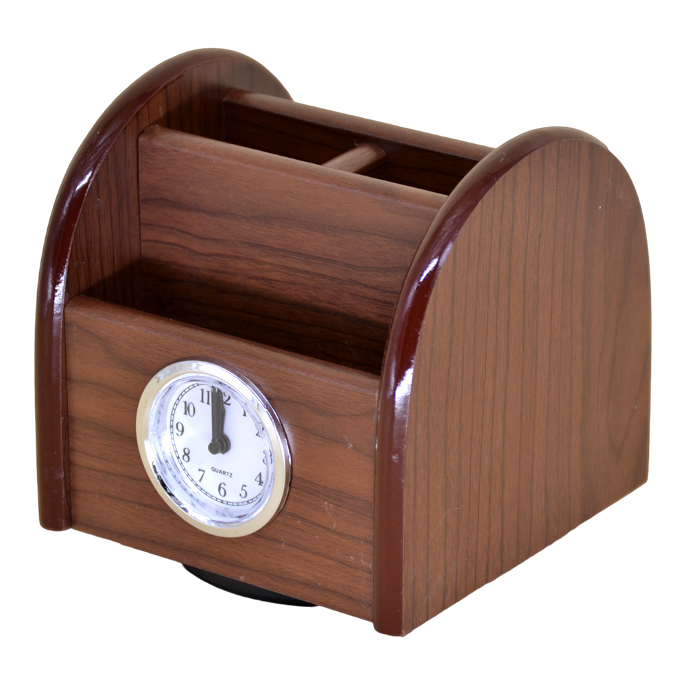Acest suport compartimentat este realizat din lemn. dotat cu ceas este ideal pentru birou. tinand la un loc instrumentele de scris. cartile de vizita sau alte articole folosite. util si pentru masurarea timpul. Deasemenea. poate fi un cadou potrivit celor dragi.
