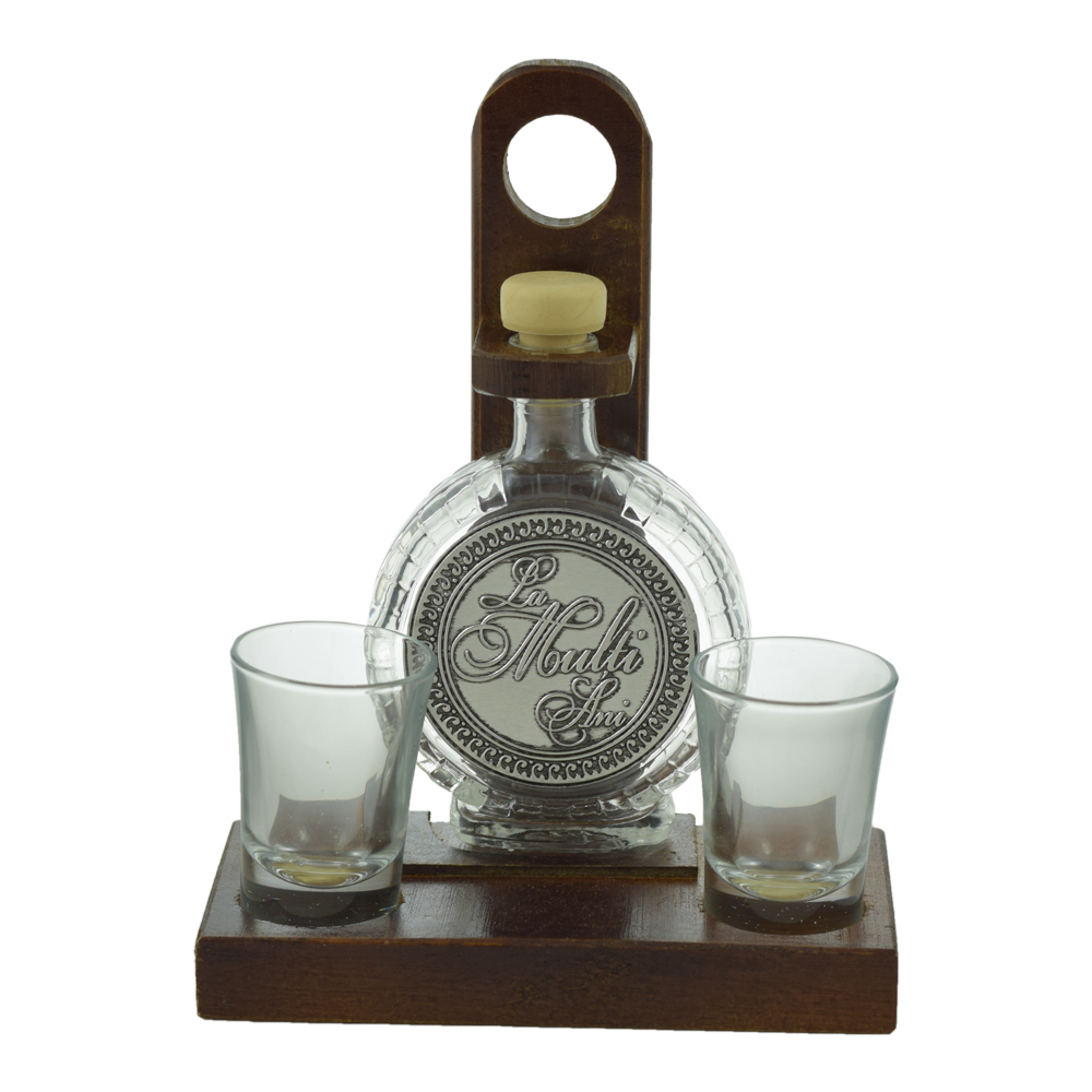Setul respectiv este alcatuit din doua pahare si o plosca care este decorata cu un abtibild tip metal embosat pe care este inscriptionat urarea de „La multi ani”. Acest set este un cadou ideal barbatilor care isi sarbatoresc ziua de nastere.