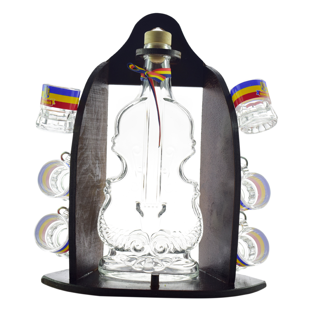 Acest set este format dintr-un suport realizat din lemn pe care se afla o sticla pentru tarie in forma de vioara si sase pahare tip shot cu un design specific romanesc in culorile nationale ale tarii. Setul este ideal pentru a completa decoratiunea miniba