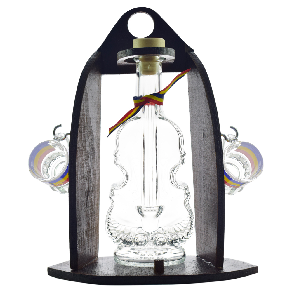 Acest set este format dintr-un suport realizat din lemn pe care se afla o sticla pentru tarie in forma de vioara si doua pahare tip shot cu un design specific romanesc in culorile nationale ale tarii. Setul este ideal pentru a completa decoratiunea miniba