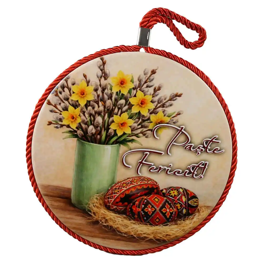 Suport oale decor din ceramica „Paste Fericit!”, 17 cm, Narcise cu oua colorate